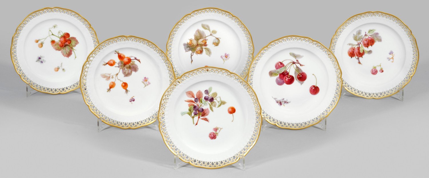 Rund mit geschweiftem Rand. Durchbrochen gearbeitete Fahne mit Lanzettbögen. Im Spiegel verschiedene Zweige mit Obst,- Früchte- und Nussdekor in feiner, polychromer Malerei mit Goldrand. Teilw. Malerzeichen für Joseph Martin (geb. 1864, Blumenmaler bei KPM von 1889-1895 und wieder ab 1898). Zepter- und Malereimarke. D. 22 cm.