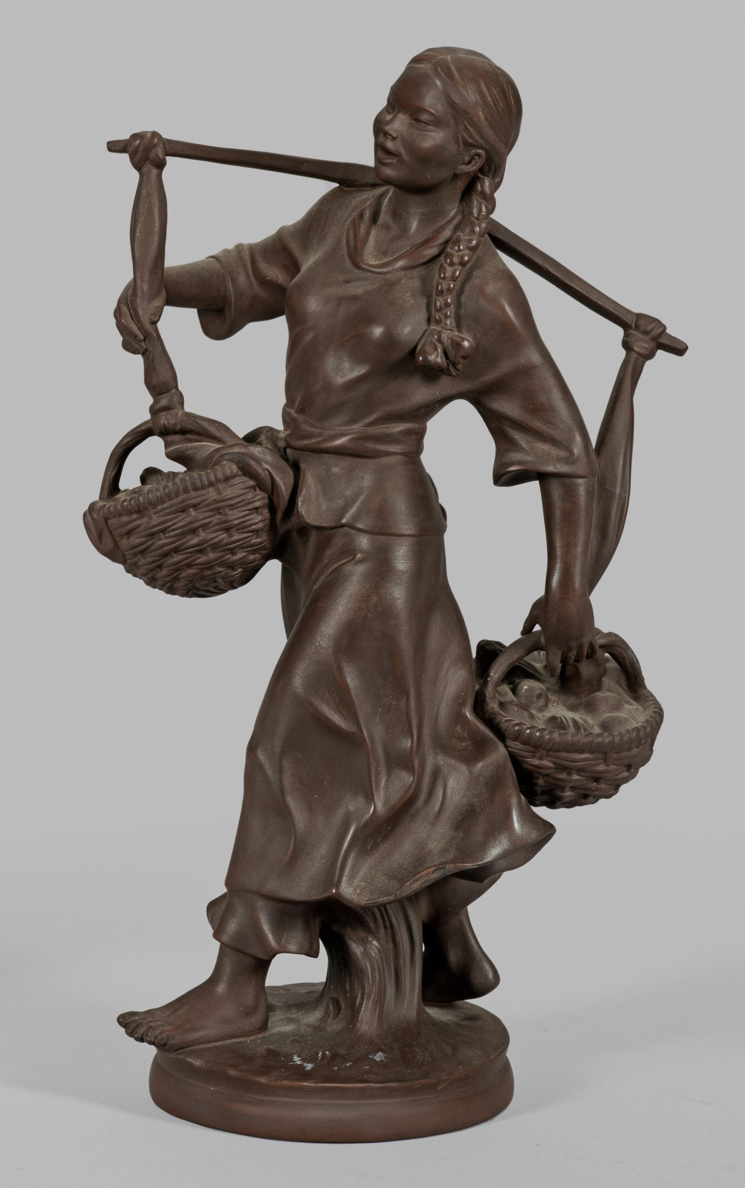 Böttgersteinzeug. Auf einem Ovalsockel die Darstellung einer schreitenden, jungen Dame mit Zöpfen und langem Kleid, zwei Körbe tragend. Entw. Max Bochmann, 1953. Modell-Nr. 85025. H. 30 cm.