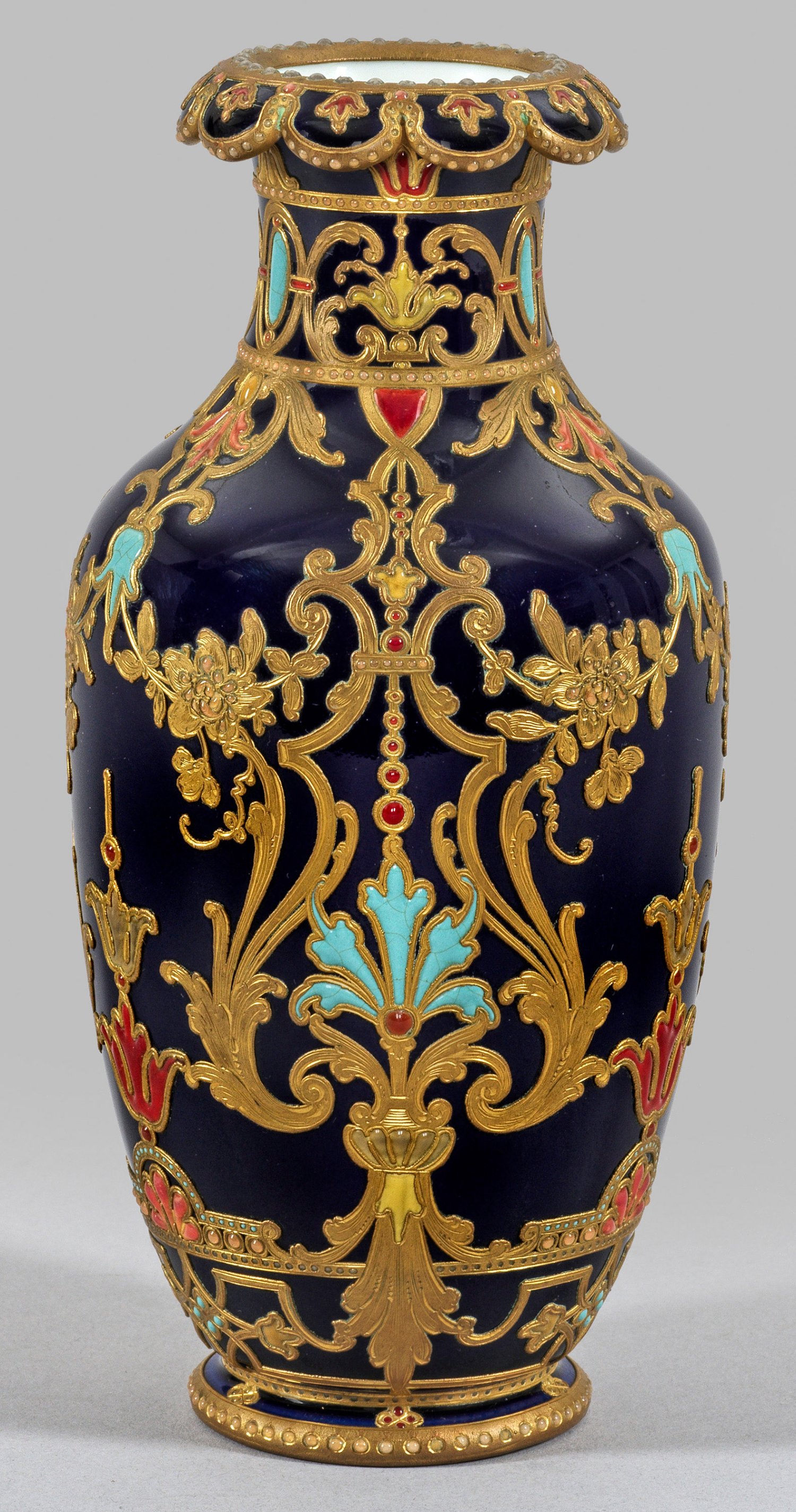 Balusterförmiger Korpus mit blütenförmig ausschwingender, passig geschweifter Mündung. Auf der Wandung umlaufender, sich wiederholender Dekor aus arabeskem Laub- und Rankenwerk in galvanischer, fein ziselierter Bronzeauflage auf kobaltblauem Fond, akzentuiert durch türkis- und framboisefarbenes sowie gelbes, erhabenes Schmelzemail. Minim. besch.; Zepter- und Malereimarke. H. 17 cm.