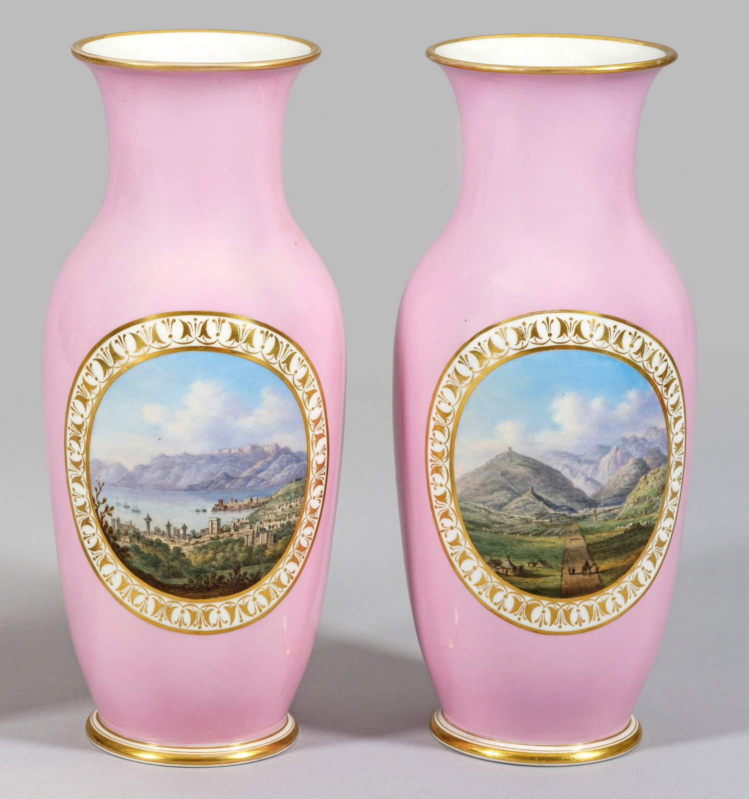 Über ausgestelltem Rundstand balusterförmiger Korpus mit eingezogenem Hals und ausschwingendem Rand. Rosafarbener Fond. Schauseitig der Wandung ovales, floral goldgerahmtes Medaillon mit der Ansicht einer südlichen Küstenstadt vor imposanter Bergkulisse bzw. der Ansicht eines Bergpanoramas. Polychrome Malerei mit Goldrand. Partiell ber.; Zepter- und teilw. Pfenningmarke. H. 31,5 cm - 32 cm.