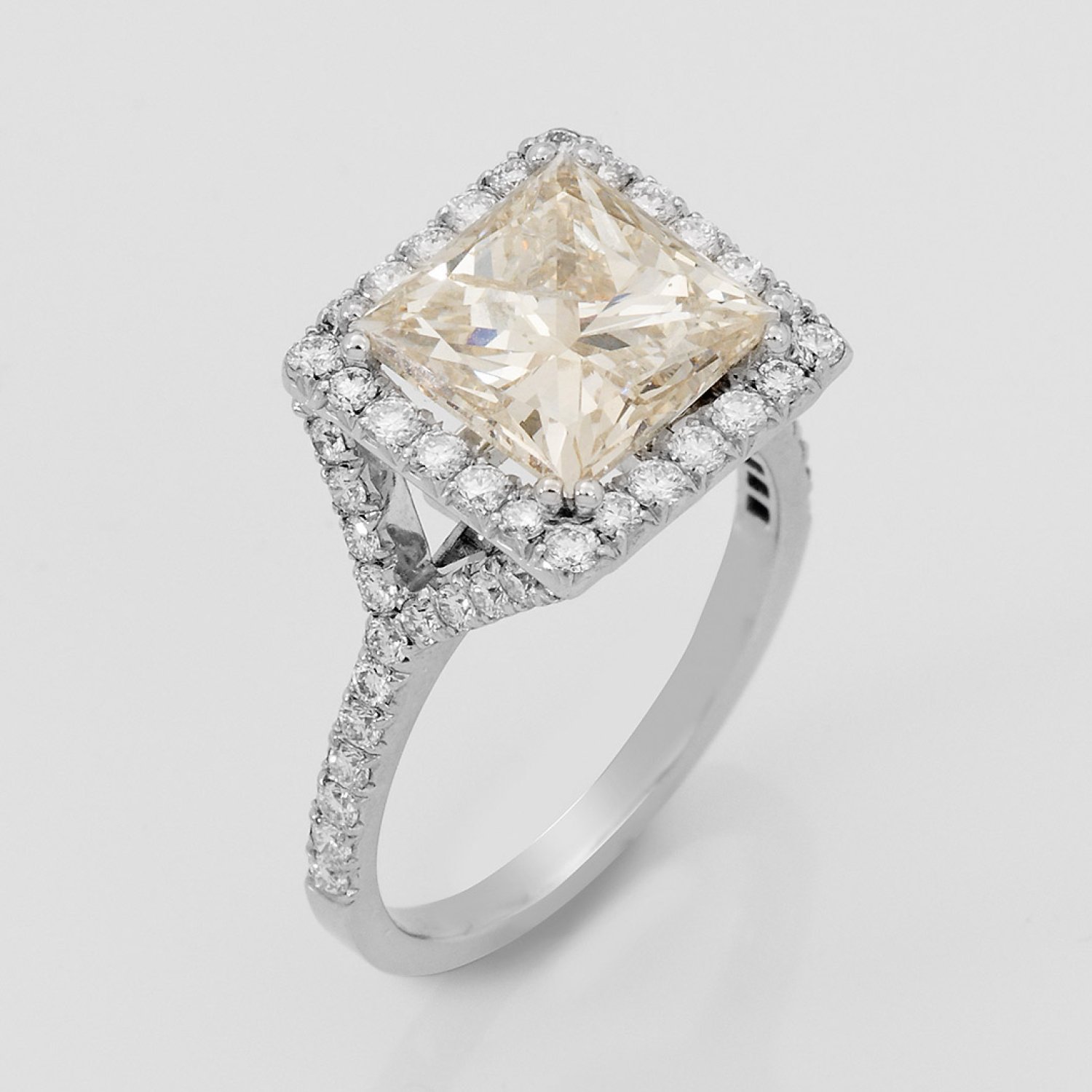 Weißgold, gest. 750. Zentral besetzt mit einem Diamanten im Prinzesscut von ca. 4,42 ct. (J/si2), entouriert von diversen kleinen Brillanten von zus. ca. 1,20 ct. (top wesselton(F-G)/vvs). Beiliegend DGI-Zertifikat.
