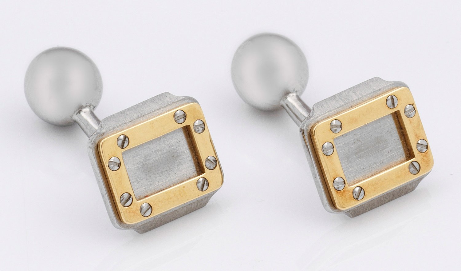 Pair of cufflinks by Cartier, in steel and 18 k gold. Maker's mark. Original box.