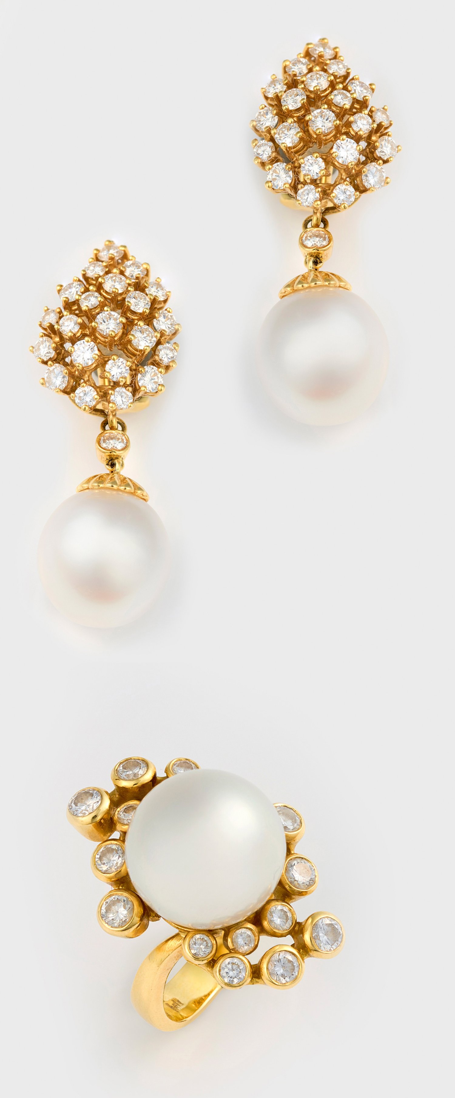 Paar Ohrgehänge mit korrespondierendem Ring. Gelbgold, gest. 750. Besetzt mit jeweils einer weißen Südsee-Perle von ca. 13 mm - 15 mm in sehr farbintensivem rosé-grün changierendem Lüster, akzentuiert durch Brillanten der Ohrclips von zus. 3,80 ct. (G/vvs) und des Rings von zus. 1,26 ct. (H/si). Ges.-Gew. ca. 35,39 g.