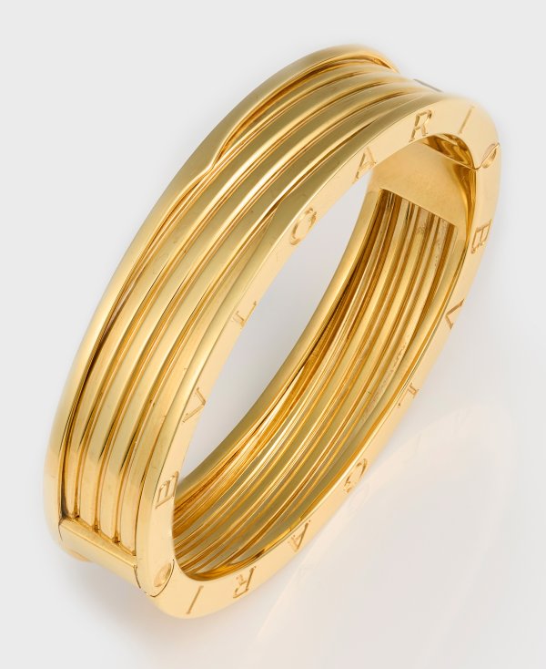 Gelbgold, gest. 750. Breiter 4-bändiger Scharnier-Reif, beidseitig mit BVLGARI BVLGARI Gravur. Herstellerzeichen. Nahezu ungetragen. Gew. ca. 75,09 g. Neupreis ca. € 13.000,-.