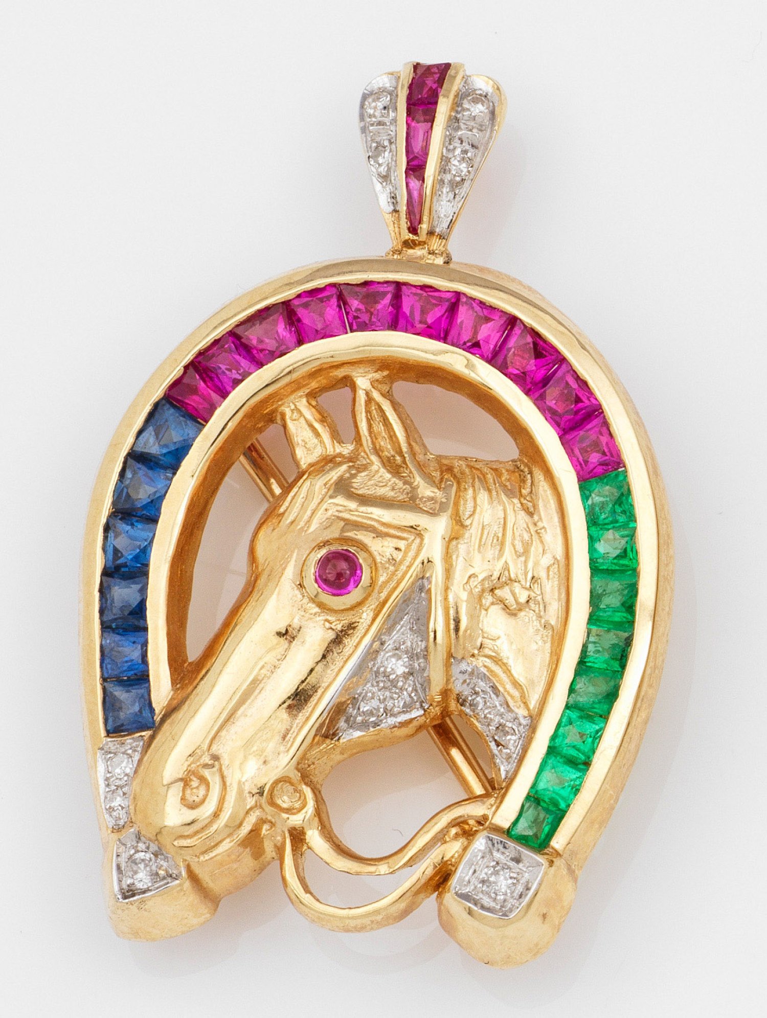 Gelbgold, gest. 585. Hufeisenform mit plastisch gearbeitetem Pferdekopf, ausgefasst mit Saphiren, Rubinen und Smaragden im Carréeschliff von zus. ca. 1,20 ct. und kleinen Diamanten, auch als Brosche tragbar. Gew. ca. 8,89 g.