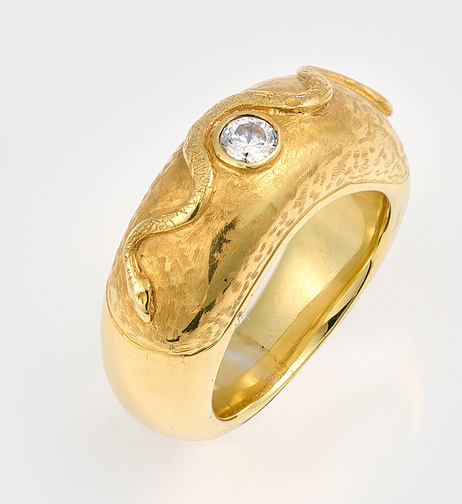 Gelbgold, gest. 585. Leicht verlaufende, massive Bandform, schauseitig satiniert, besetzt mit Zirkonia. Gew. ca. 22,65 g.