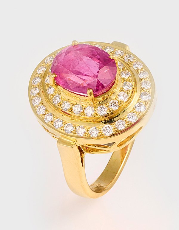 Gelbgold, gest. 750. Zentral besetzt mit einem pinkfarbenen Rubin von ca. 4,21 ct., entouriert von Brillanten von zus. ca. 0,84 ct. (H/vs); Ges.-Gew. ca. 9,08 g.