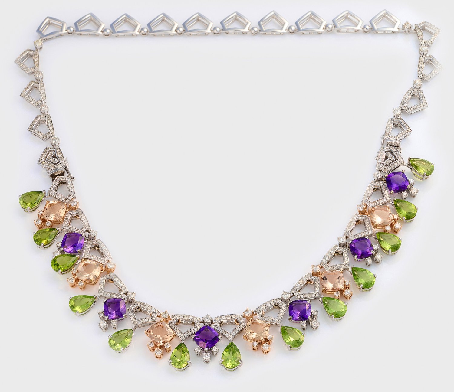 Necklace set with diamonds approx. 5,90 ct., peridots approx. 15,10 ct., amethysts approx. 7,75 ct. and morganites approx. 7,79 ct., in 14 k white gold.