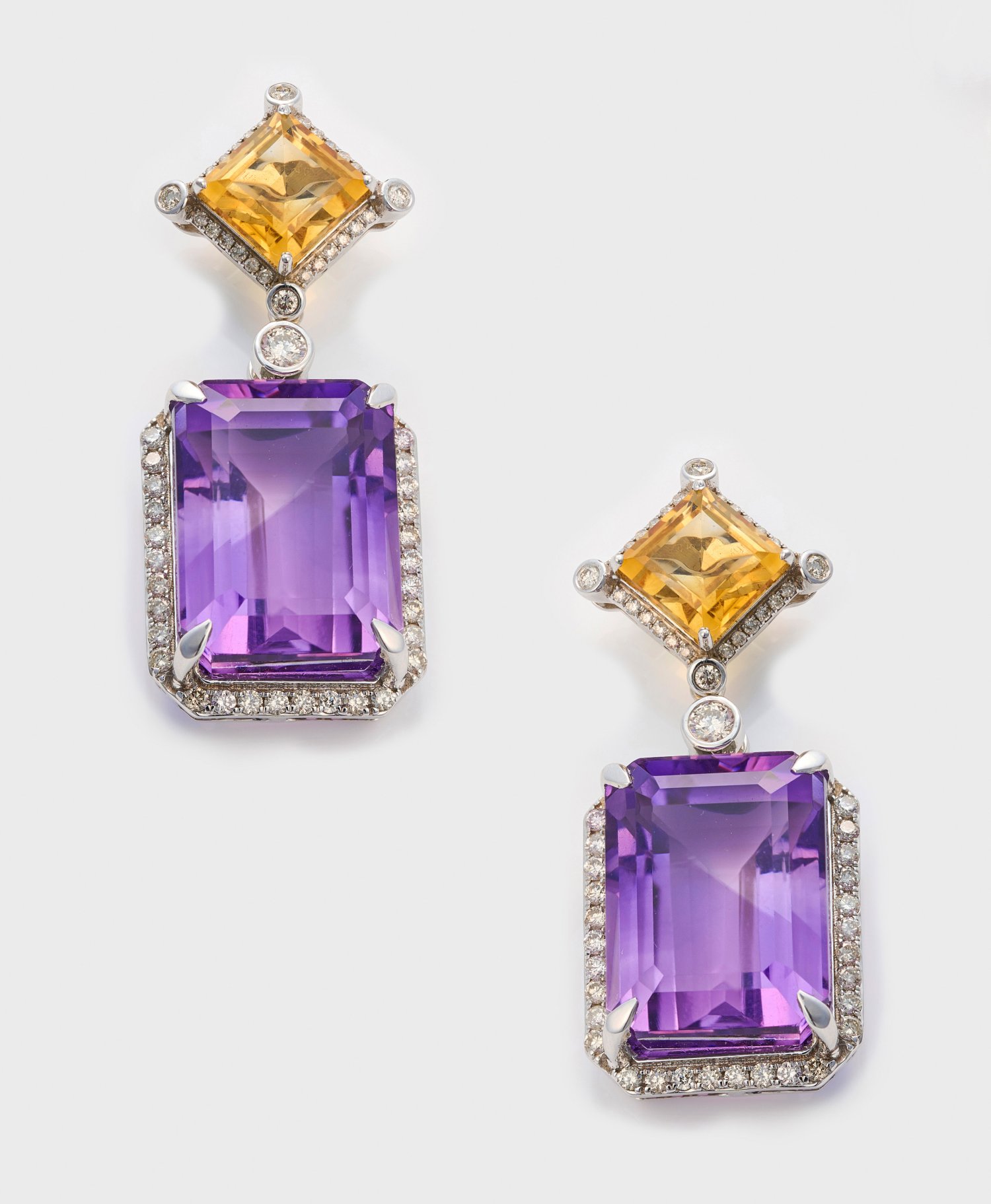 Pair of earrings set with citrines approx. 5,18 ct., amethysts approx. 37,02 ct. and diamonds approx. 1,68 ct., in 14 k white gold.