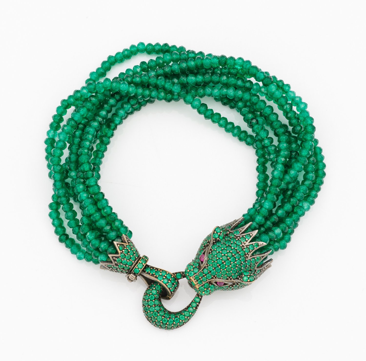 Silber. 8-reihiges Armband aus leuchtendgrünen, facettierten Quarzit-Kugeln und plastisch gestaltetem Panthère-Kopf aus grün gefärbtem Achat.