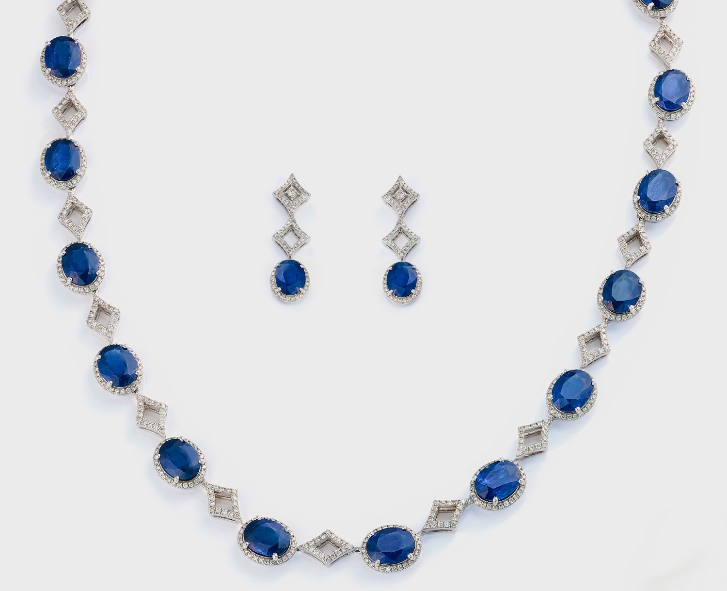Necklace and a pair of earrings set with royal blue sapphires approx. 42,08 ct. and diamonds approx. 4,22 ct., in 18 k white gold.