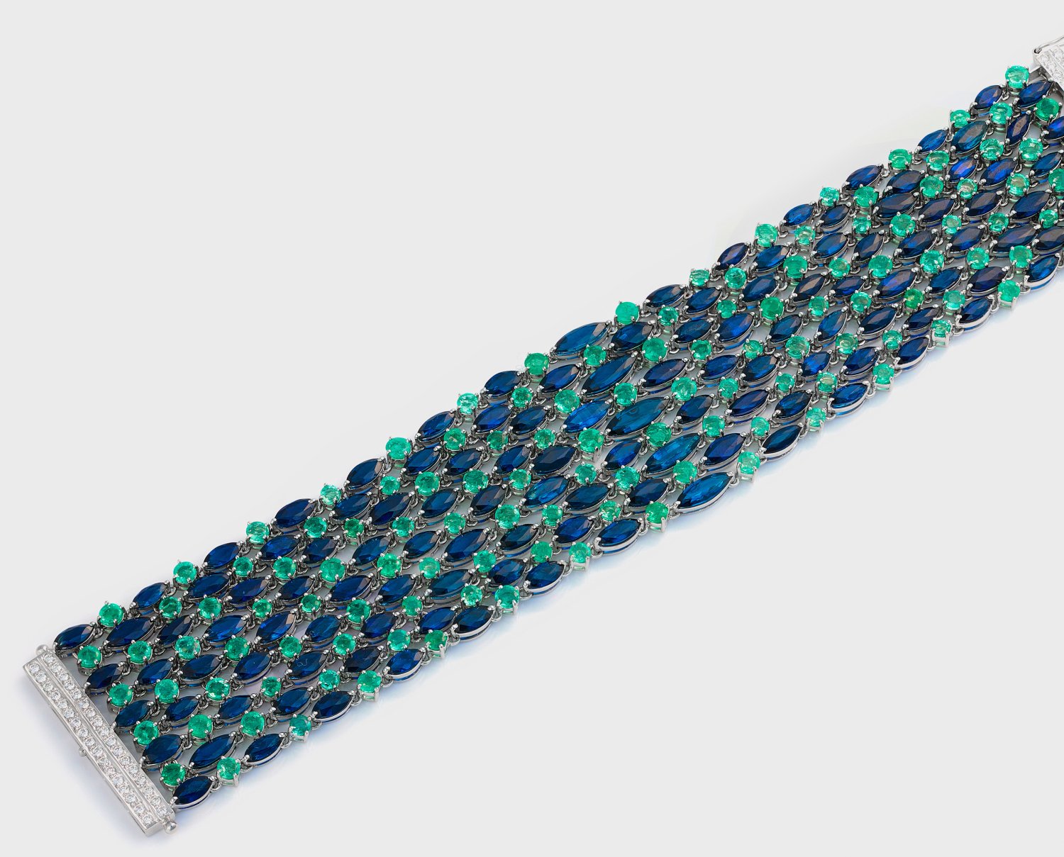 Weißgold, gest. 750. Schauseitig ausgefasst mit nahezu kornblumenblauen Saphir-Navetten von zus. ca. 47,49 ct. und Smaragden von zus. ca. 16,45 ct., akzentuiert durch Brillanten von zus. ca. 0,80 ct.; Gew. ca. 80,89 g.