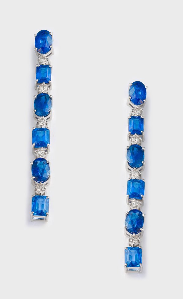 Pair of earrings set with nearly cornflower blue sapphires approx. 7,10 ct. and brilliants approx. 0,42 ct., in 18 k white gold.