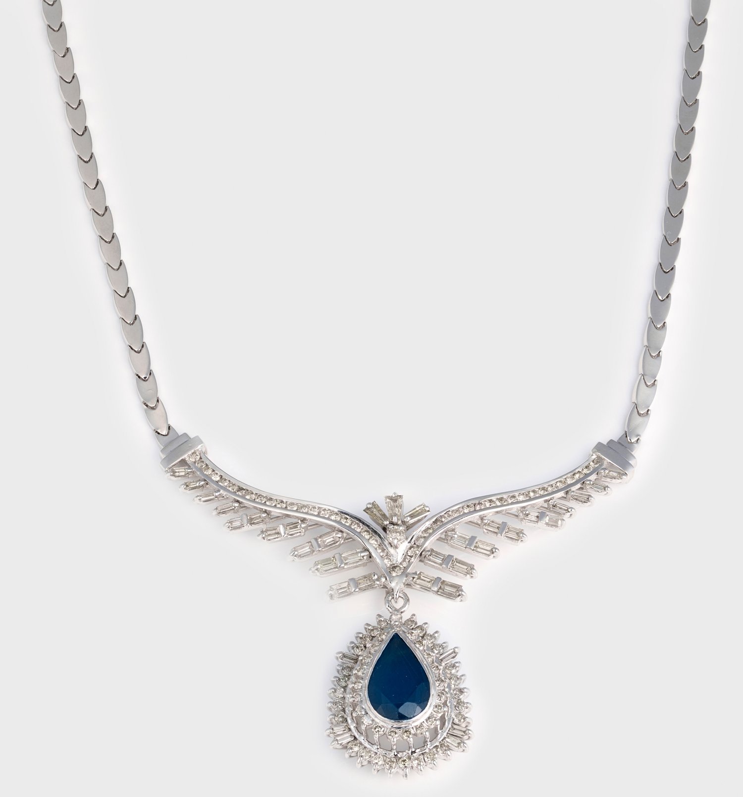 Weißgold, gest. 750. Zentral besetzt mit tiefblauem Saphirtropfen von ca. 4,00 ct., ausgefasst mit Brillanten und Diamantbaguetten von zus. ca. 2,60 ct.; Gew. ca. 32,88 g.
