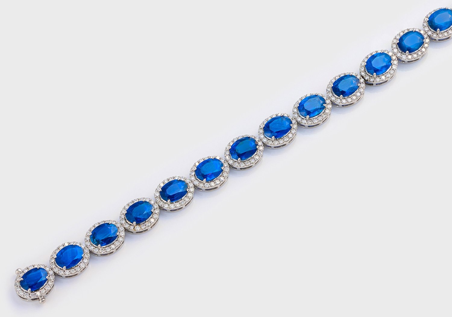 Bracelet set with 16 nearly cornflower blue sapphires approx. 24,51 ct. and diamonds approx. 3,01 ct. (H/si), in 18 k white gold.