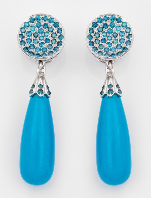 Pair of earrings set with turquoise approx. 31,75 ct. and blue diamonds approx. 1,85 ct., in 18 k white gold.