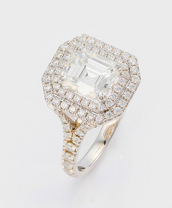 Weißgold, gest. 585. Zentral besetzt mit einem Diamantsolitär von ca. 1,78 ct. (F-G/vvs), im Emeraldcut, entouriert von Brillanten von zus. ca. 1,20 ct.; Gew. ca. 4,31 g.