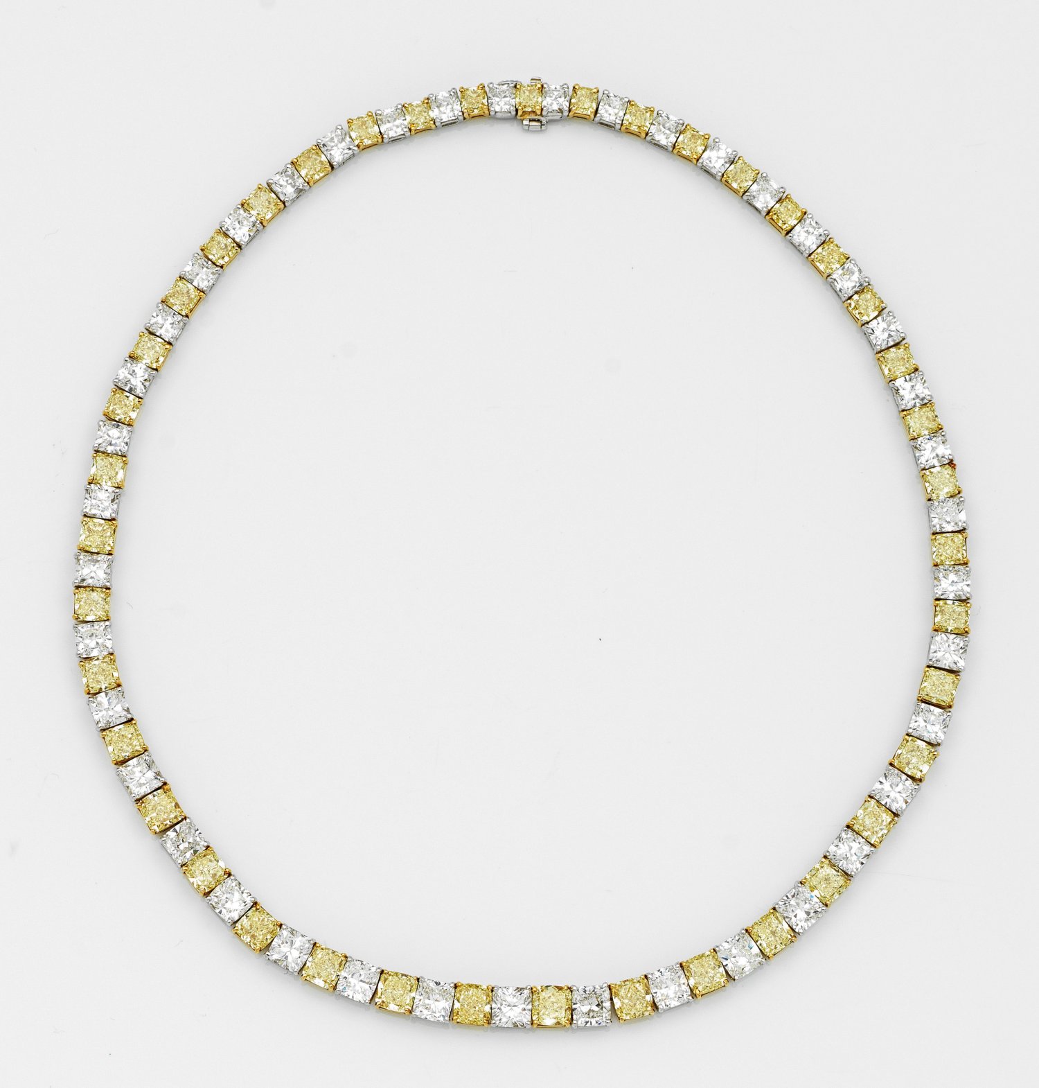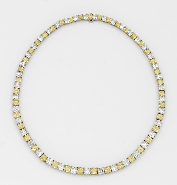 Necklace set with a total of 82 diamonds approx. 53,04 ct. incl. natural fancy yellow diamonds approx. 27,25 ct. (vvs-vs) and white diamonds approx. 25,79 ct. (D/E/F/G/vvs/vs/si) in cushioncut, in 18 k white gold and platinum. Certificates included.