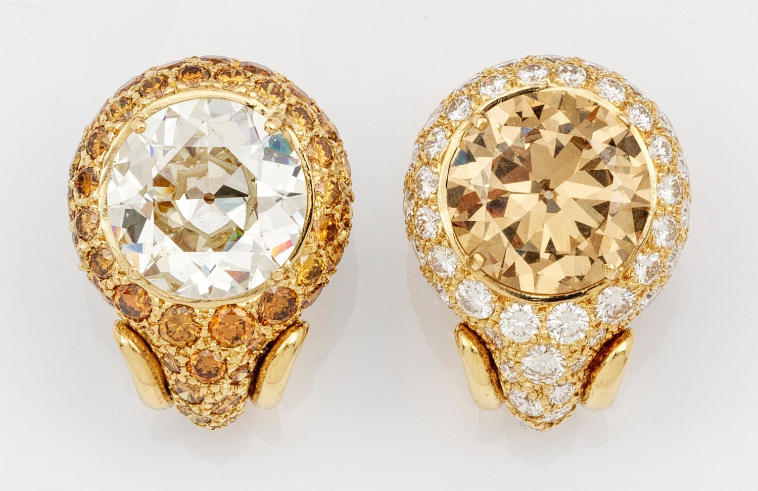 Pair of earrings by Hemmerle set with a brilliant solitaire approx. 7,191 ct. (L/si1), fancy greyish yellow brown brilliants approx. 7,860 (vs1) and diamonds approx. 5,00 ct. (H/vvs-vs), in platinum and 18 k gold.