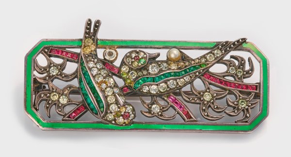 Silber, gest. Sterling, teilw. emailliert. In Ajour gestaltete Brosche mit einem Vogelpaar auf einem Zweig, besetzt mit farblosen Steinen, Farbsteinen und Saatperlen (1 Perle fehlt). Gew. ca. 10,50 g.
