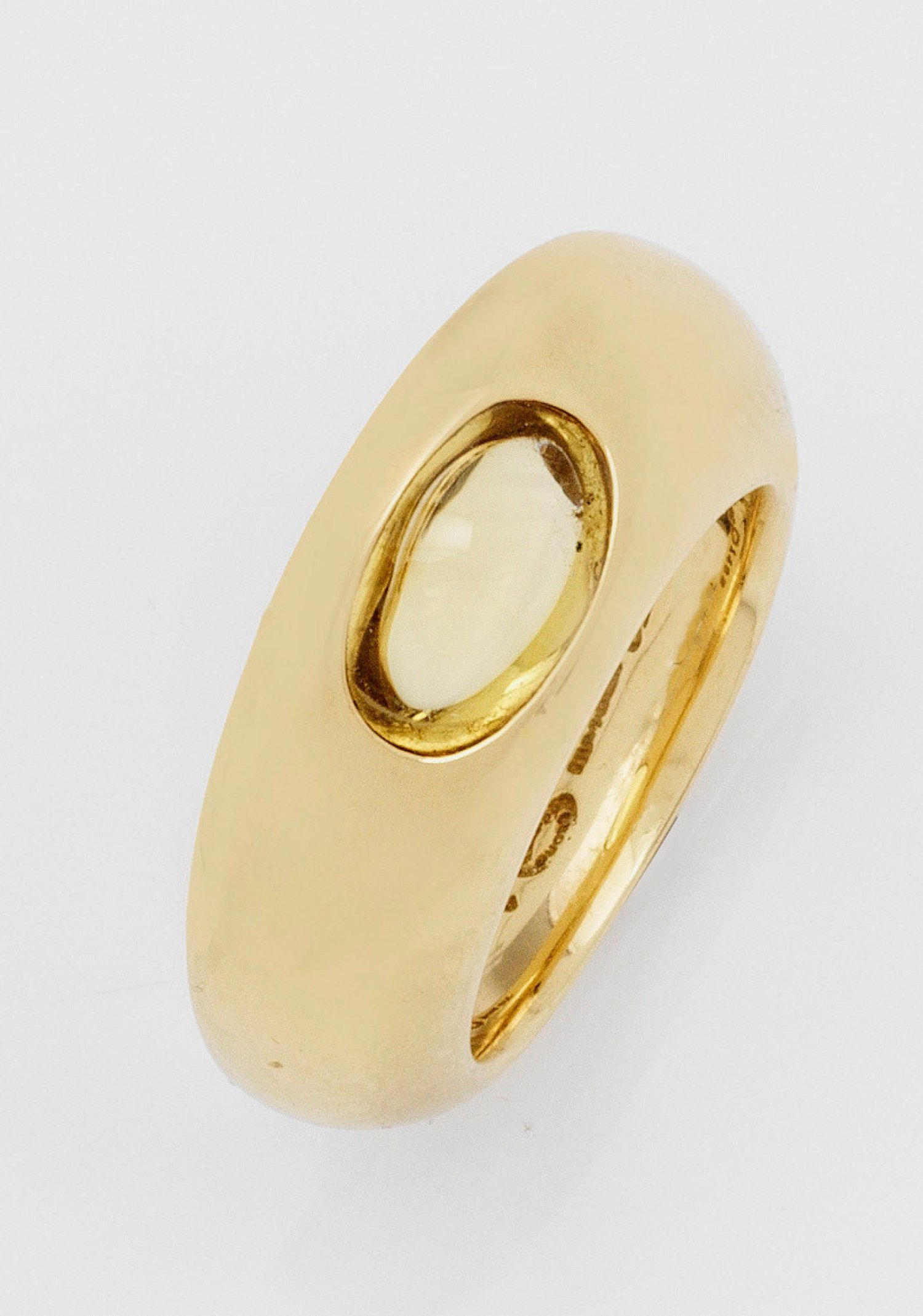 Gelbgold, gest. 750. Zentral besetzt mit einem gelben Citrin-Cabochon. Nach einem Entw. von Kim Buck. Modellnr. 1492. Herstellerzeichen. Gew. ca. 13,79 g.