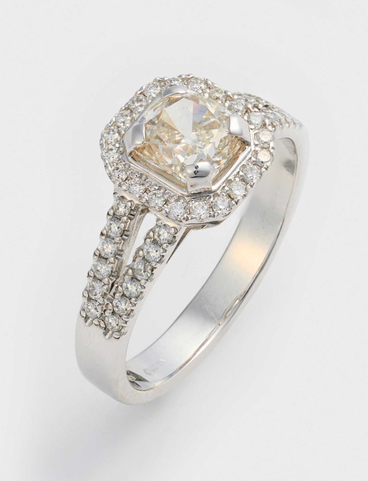 Weißgold, gest. 750. Zentral besetzt mit Diamanten von ca. 1,10 ct. (K/vvs2) im Cushioncut, entouriert von Brillanten von zus. ca. 0,50 ct. (G-H/vvs). Gew. ca. 5,31 g.