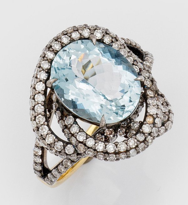 Gelbgold, 14 ct. und Silber. Zentral besetzt mit einem himmelblauen Aquamarin von ca. 3,30 ct., akzentuiert durch kleine Altschliffdiamanten von ca. 1,08 ct.; Gew. ca. 4,60 g.