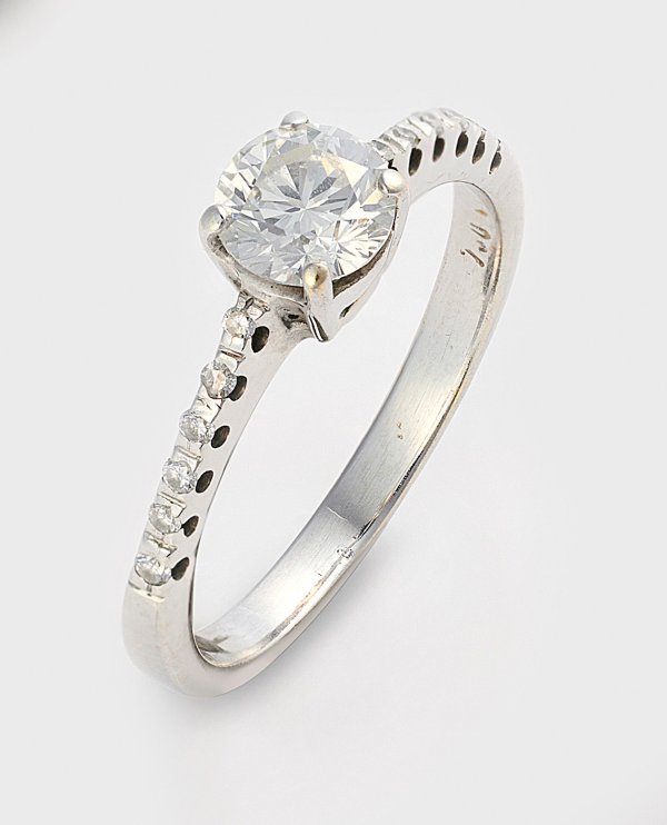Weißgold, gest. 750. Zentral besetzt mit einem Brillantsolitär von ca. 0,55 ct. (F-G/vs), flankiert von kleinen Diamanten. Gew. ca. 2,68 g.