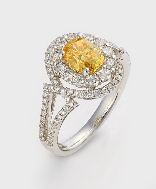 Weißgold, gest. 750. Zentral besetzt mit einem Orange Yellow-Diamanten von ca. 1,00 ct. (if-vvs), entouriert von Brillanten von zus. ca. 1,30 ct. (H/vvs). Gew. ca. 5,99 g.
