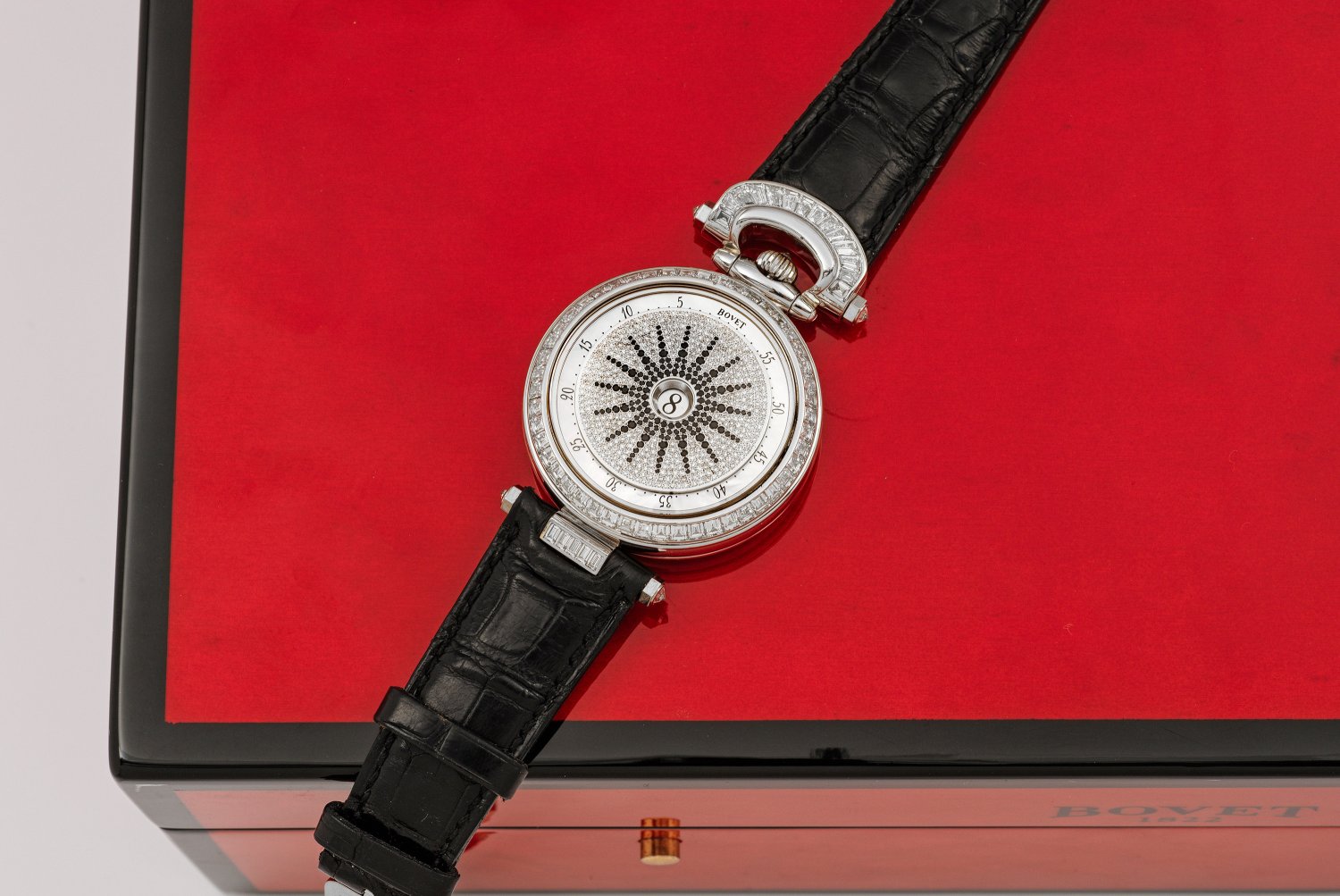 Gentlemen's wristwatch by Bovet Fleurier-Tourbillon, set with white and black diamonds, automatic movement, in 18 k white gold. Original box and paper.