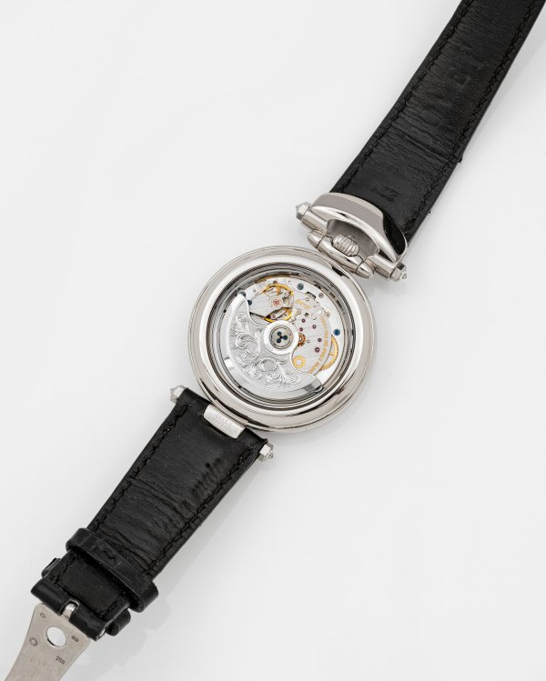 Weißgold, 18 ct.; Rundes Uhrengehäuse, Lünette umlaufend mit Diamant-Trapezen besetzt, Perlmutter-Zifferblatt, zentrales Medaillon mit schwarzen und weißen Diamanten. Verglaster Boden. Schwarzes, geprägtes Lederarmband mit Weißgold-Faltschließe. Automatikwerk. Herstellerzeichen, Ref.-Nr. CP001/004250-1869. Original Holzbox und Zertifikat.