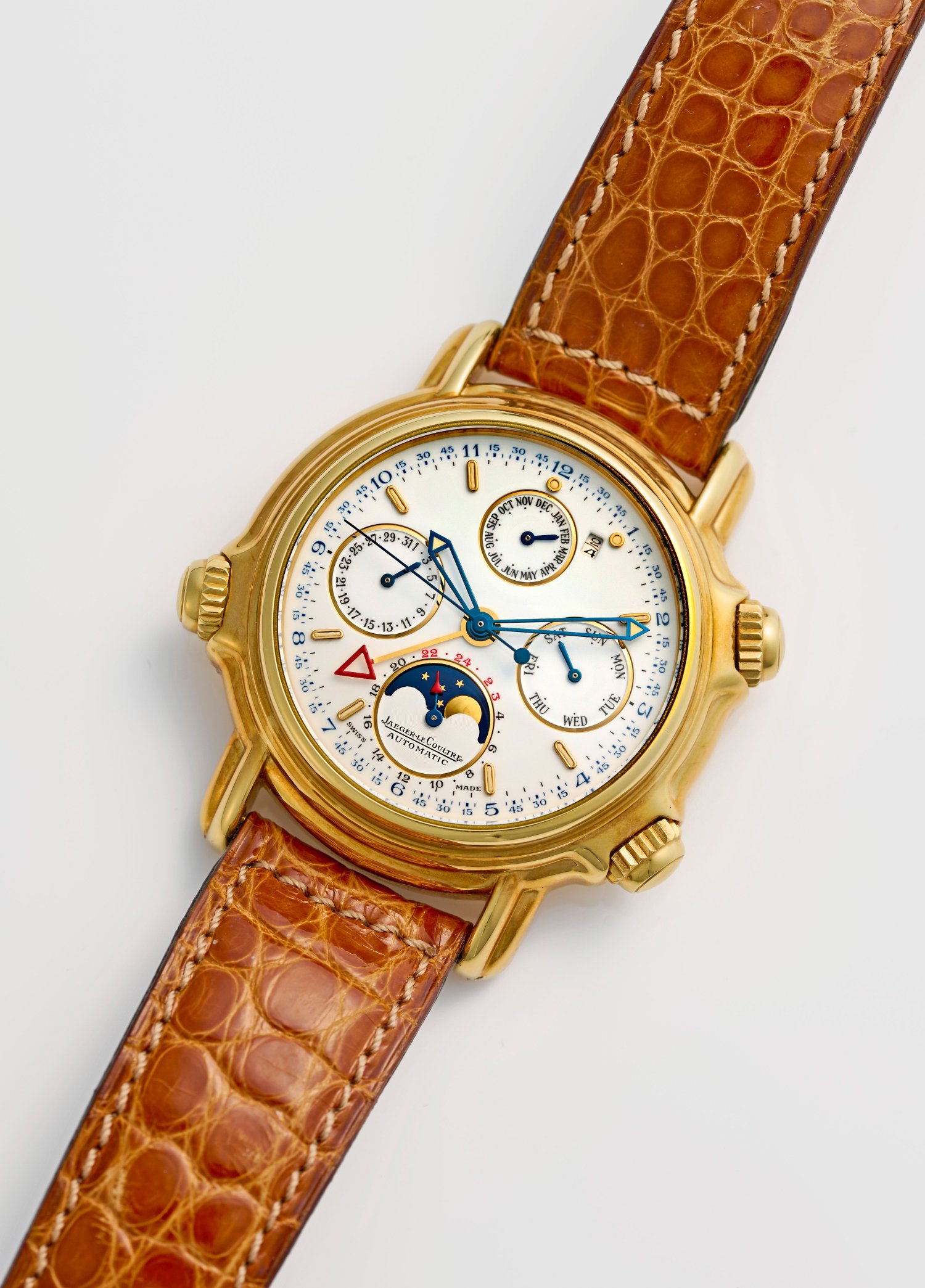 Gentlemen's wristwatch by Jaeger LeCoultre, automatic movement with calendarium, alarm, in 18 k gold. Maker's mark. Original box and paper.