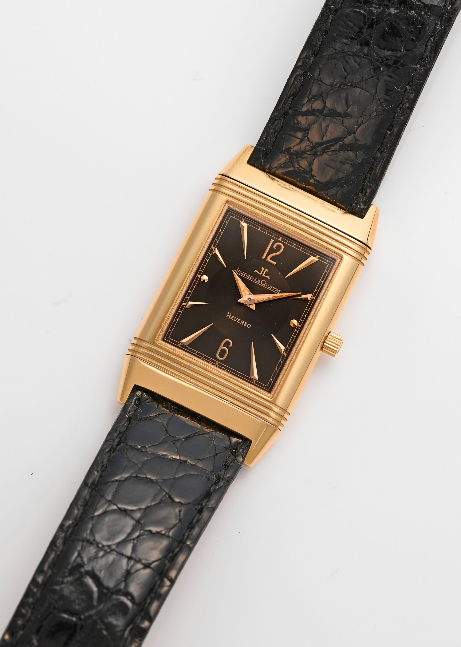Roségold, gest. 750. Rechteckiges, drehbares, profiliertes Uhrengehäuse, schwarzes Zifferblatt, arabische Zahlen, Lanzenindexe und Zeiger. Schwarzes, geprägtes Lederarmband mit Roségold-Dornenschließe. Mechanisches Werk mit Handaufzug. Herstellerzeichen, Ref.-Nr. 250.290.867, Gehäuse-Nr. 1309. Gew. ca. 44,31 g. Originales Lederetui und Garantie-Pass.