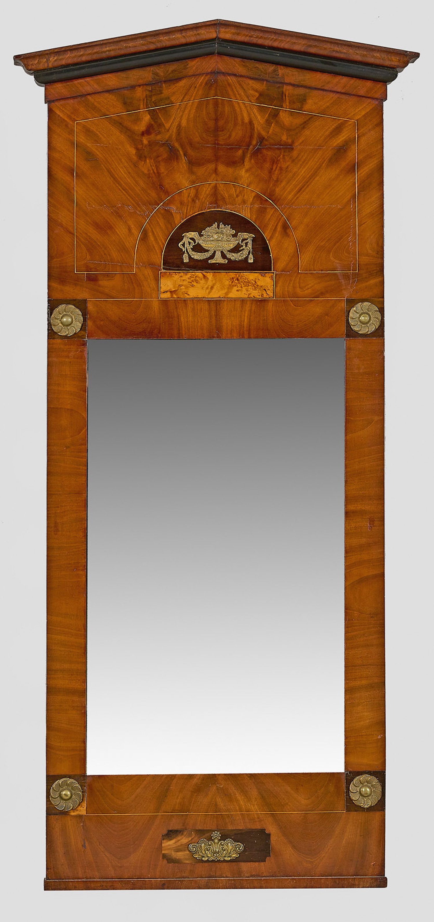 Mahagoni, furniert und partiell ebonisiert sowie Intarsien aus Ahorn und Applikationen aus Messing. Gerade, hochrechteckige Spiegelrahmung mit applizierten Rosettenmotiven. Oberhalb breites Giebelfeld mit aufgelegter Vase sowie profilierter Giebelabschluss. 143 cm x 66 cm.