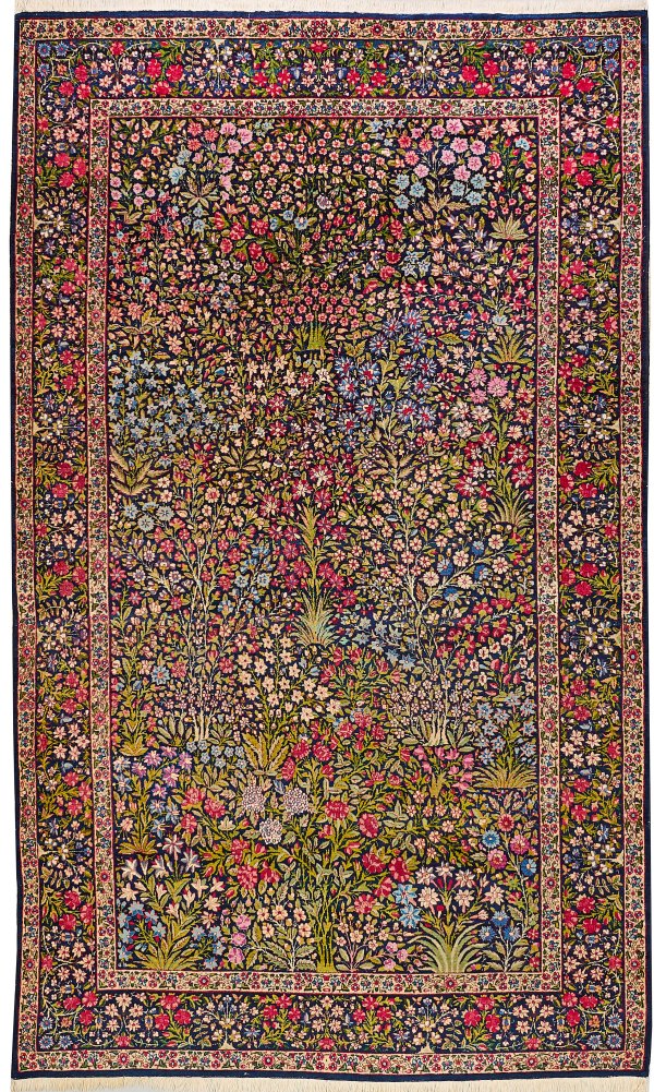 Persien. Wolle auf Baumwolle. Feine Knüpfung. Auf dunklem Fond flächendeckend dichte Musterung aus üppigen Blütenrispen, Dolden- und Zweigen. Umlaufend breite, entsprechende Hauptbordüre, flankiert von kontrastierenden Nebenbordüren. 150 cm x 255 cm.