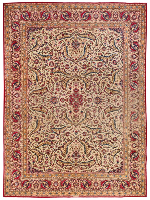 Persien. Um 1940. Wolle auf Baumwolle. Im cremefarbenen Innenfeld flächendeckendes, großzügig angelegtes Arabeskenmuster aus großen Plattranken. Umlaufend breite Bordüre aus üppigen Palmettenranken, flankiert von schmalen Bändern. Sign.; 423 cm x 316 cm.