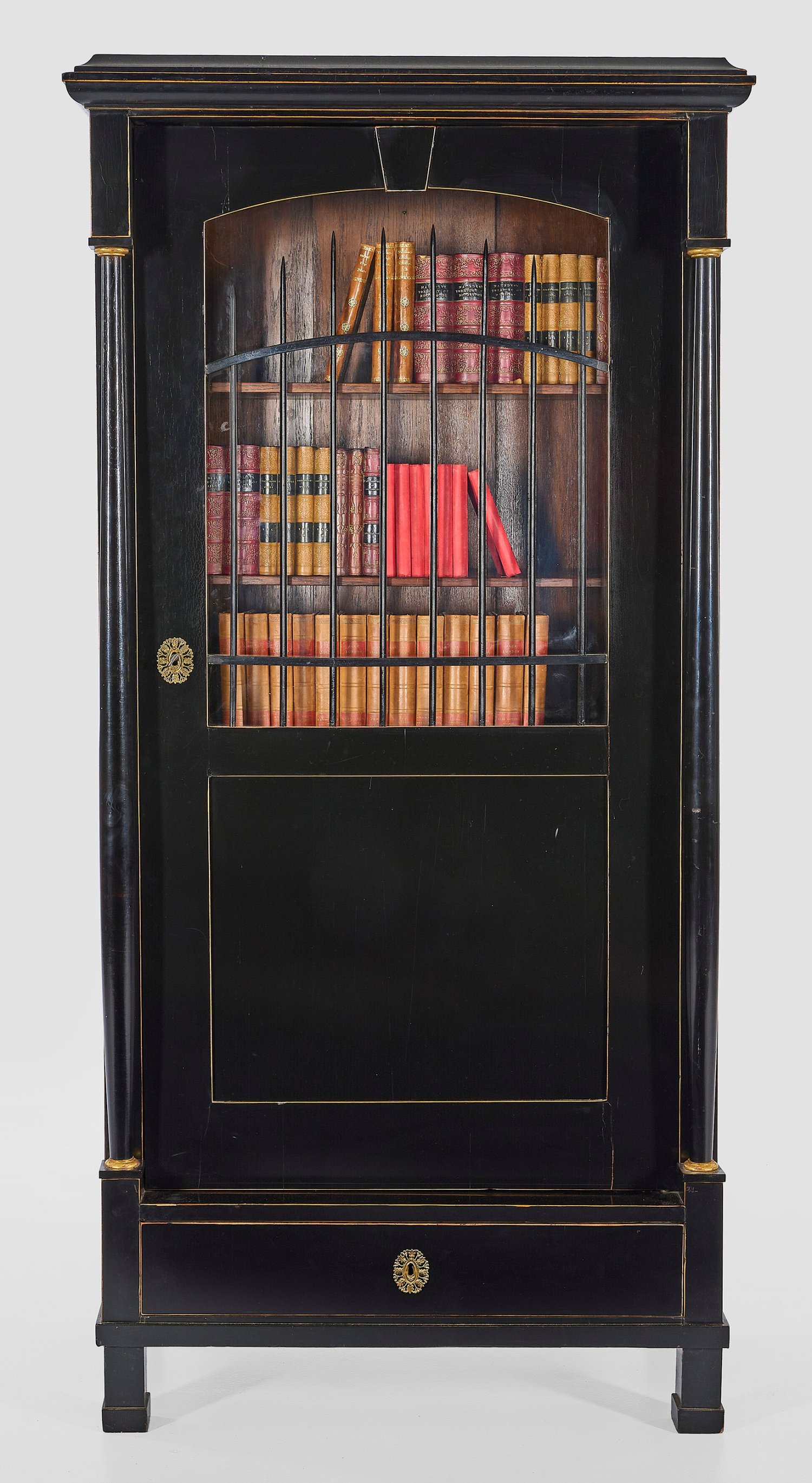 Holz, ebonisiert und teilw. vergoldet. Gerader, hochrechteckiger Korpus flankiert von eingestellten Vollsäulen auf gekanteten Füßen. In der gegliederten Front kassettierte Vitrinentür mit Gitterwerk sowie schmales Schubfach. Oberhalb schmales Profilgesims. Erg.; H. 173 cm. 85 cm x 43 cm.