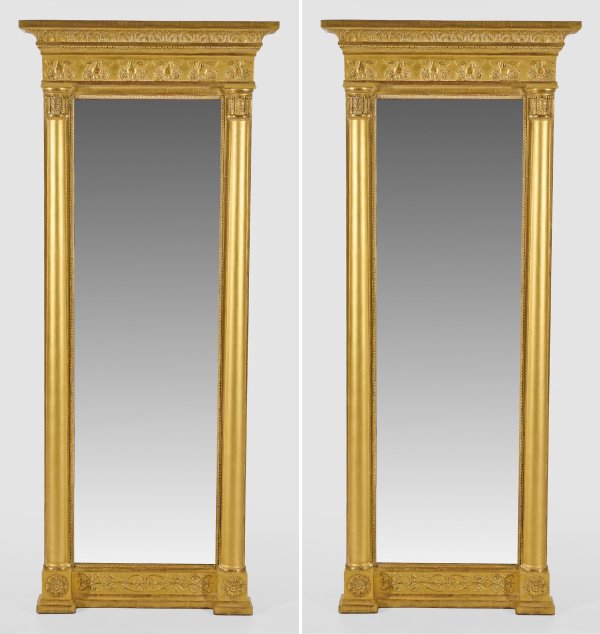 Holz, stuckiert gefasst und vergoldet. Gerade, hochrechteckige Spiegelrahmung, umlaufend mit schmalem Palmettenfries, flankiert von eingestellten Halbsäulen mit Kapitellen aus Akanthusblatt. Oberhalb Giebelfeld mit erhaben reliefierten, gereihten Schwanenmotiven sowie mehrfach profiliertes Gesims mit breitem Palmettenfries. Unterer Abschluss aus arabesk angeordneten Voluten. Unbez.; Rest.; 176 cm x 73 cm.