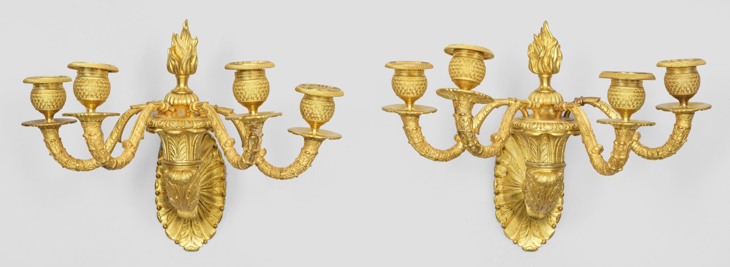 4-flg.; Bronze, vergoldet. Hochovales, blattreliefiertes Wandschild. In der Mitte davon ausgehend kräftige Volute sowie kelchförmiges Kapitell mit reliefierten Akanthusblättern und Flammenbekrönung. Stark geschwungene, blattreliefierte Leuchterarme mit vasenförmigen Tüllen über kleinen Traufschalen. H. 24 cm.