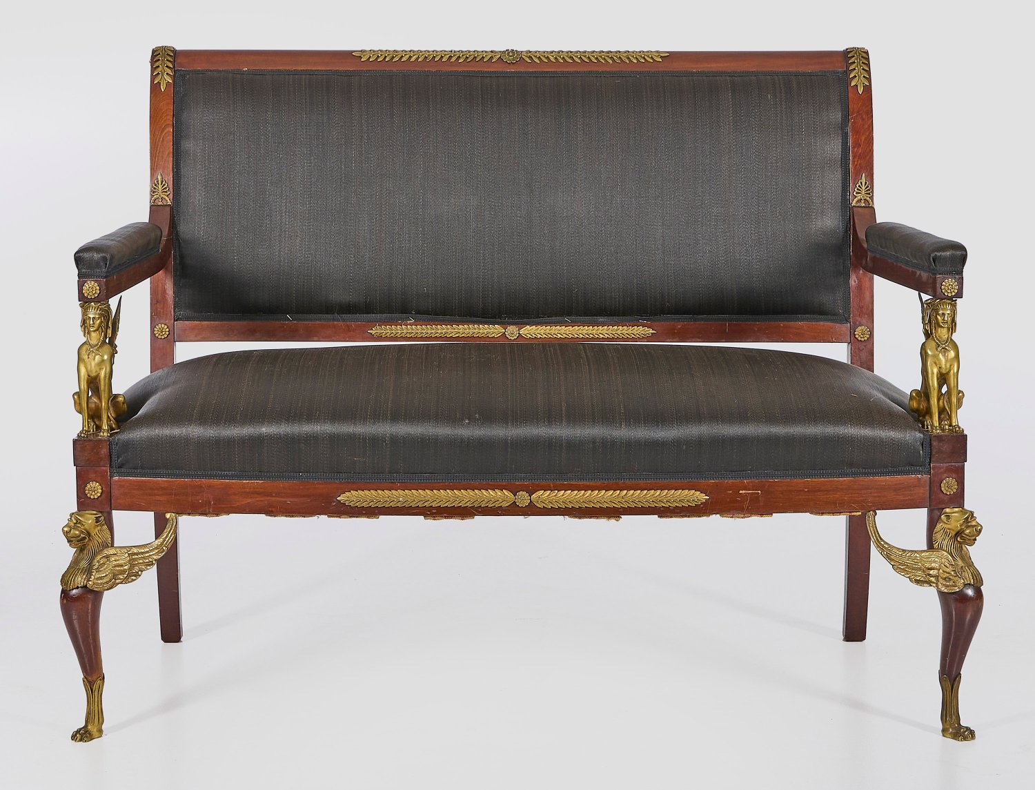 Mahagoni, massiv und furniert sowie Applikationen aus Bronze. Gerade Zarge auf geschweiften Beinen mit Chimärenköpfen. Vollplastische Sphinxen als Stützen für schmale Armlehnen. Rechteckige, leicht zurückschwingende Rückenlehnenrahmung. Gepolstert und allseitig mit schwarzem Rosshaar bezogen. H. 100 cm. 135 cm x 60 cm. Sitz-H. 50 cm.
