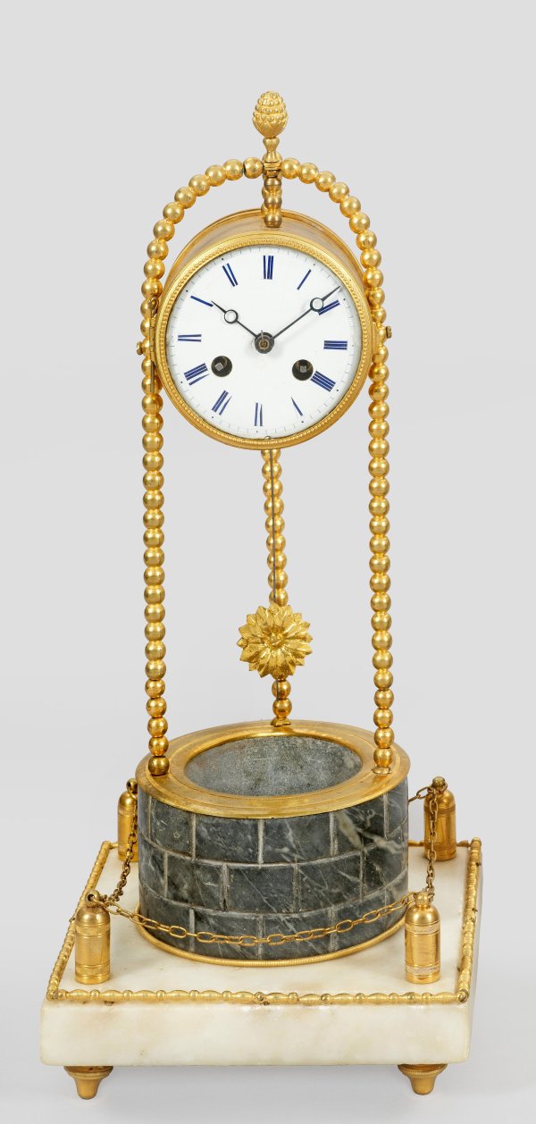 Weißer und grau gemaserter Marmor sowie vergoldete Bronze. Über quadratischem, profilgerahmten Sockel Darstellung eines Brunnen mit hohen Streben aus Perlstab als Träger für rundes Uhrengehäuse mit verglastem, erg. Emailzifferblatt. Pendulenwerk mit Fadenaufhängung sowie Halbstundenschlag auf Glocke. H. 41 cm. 17,5 cm x 17,5 cm.