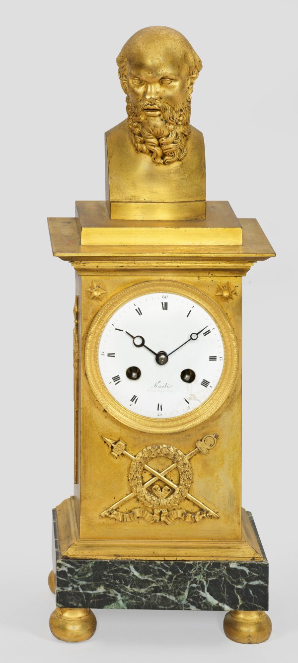 Bronze, vergoldet sowie grün gemaserter Marmor. Über profiliertem Sockel und gedrückten Kugelfüßen hochrechteckiges Uhrengehäuse. Bekrönung aus einer Büste des antiken Philosophen Sokrates. Profilgerahmtes, besch. Emailzifferblatt bez. Kinable. Pendulenwerk mit Fadenaufhängung sowie Halbstundenschlag auf Glocke. H. 42,5 cm.