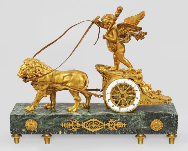 Dunkelgrüner, hellgrün gemaserter Marmor und vergoldete Bronze. Gerader, querrechteckig angelegter Sockel mit applizierten Rosettenmotiven auf Balusterfüßen. Oberhalb vollplastische Darstellung eines Amorknaben mit Keule in einem von einem Löwen gezogenen Streitwagen als Allegorie auf die Kraft der Liebe. Emaille-Ziffernring mit römischen Zahlen. Pendulenwerk mit Pendelfeder sowie Halbstundenschlag auf Glocke. Platine bez. Medaille d'argent 1855. H. 36 cm. 43 cm x 11 cm.