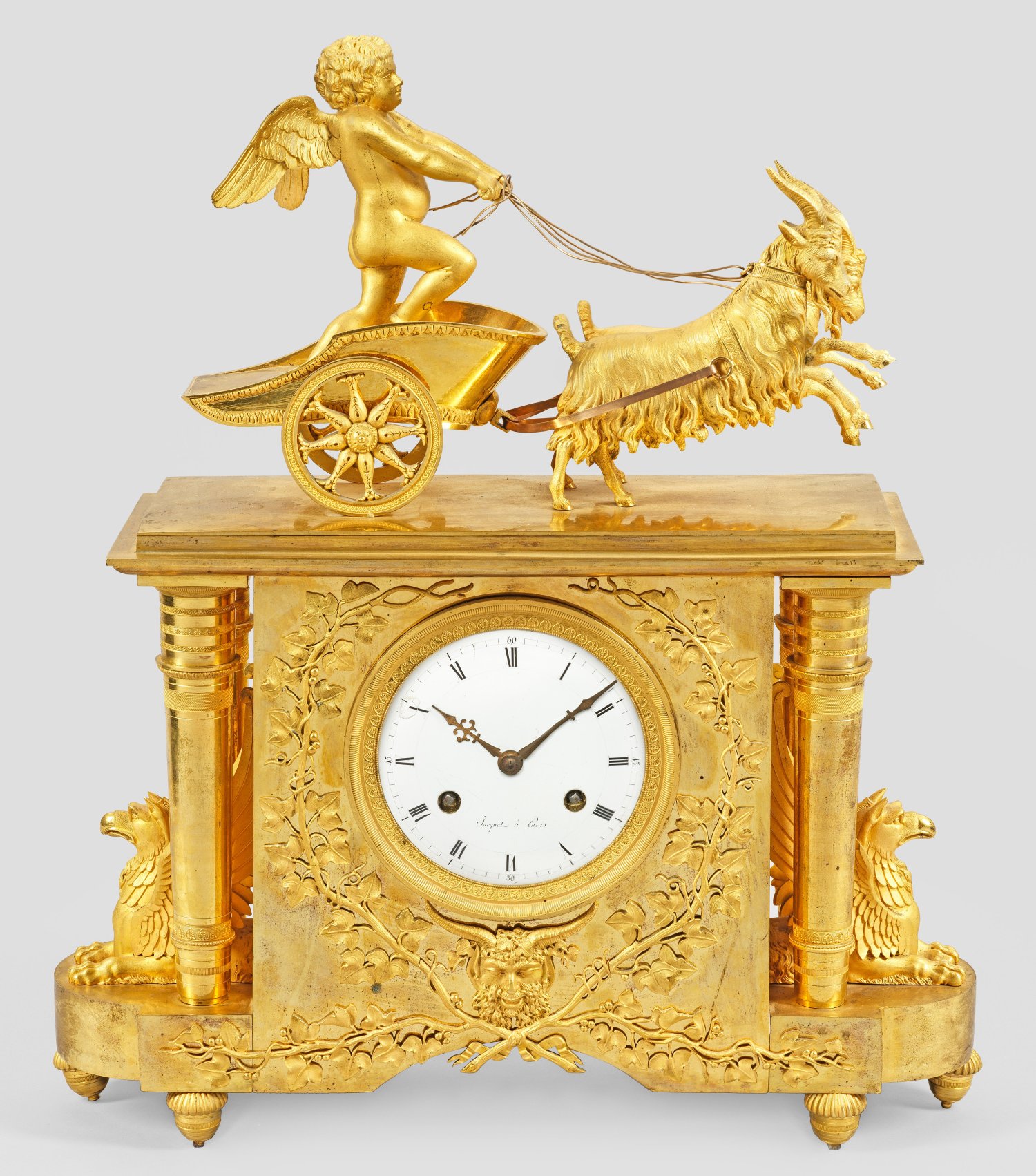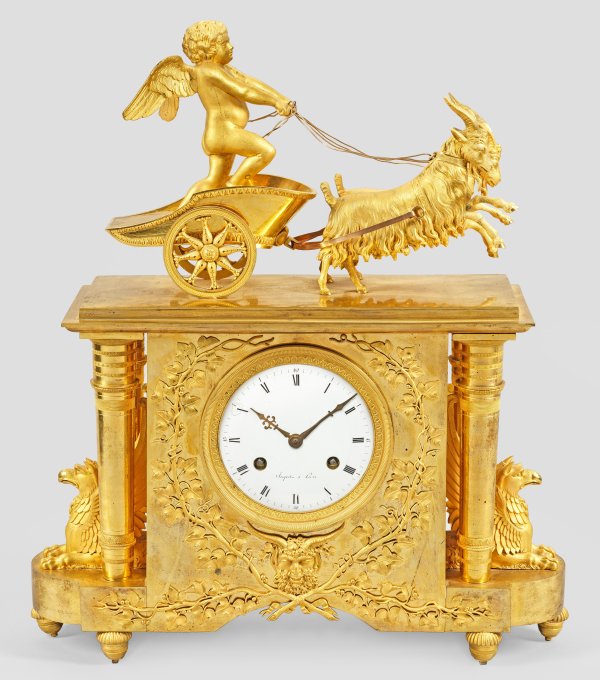 Bronze, feuervergoldet. Querrechteckig angelegter, architektonisch gegliederter Korpus, im Sockelbereich mit Apsiden, flankiert von plastischen, ruhenden Greifen und paarweise angeordneten, sich konisch verbreiternden Vollsäulen mit schmalen Zierfriesen. In der Front großes, profilgerahmtes, besch. Emailzifferblatt, bez. Jacquot à Paris, umgeben von applizierten Weinranken und Faunskopf. Oberhalb vollplastische Bekrönung in Gestalt Amors, in einem von Ziegenböcken gezogen Streitwagen. Pendulenwerk mit Fadenaufhängung und Halbstundenschlag auf Glocke, überholungsbedürftig. H. 50 cm. 43 cm x 12 cm.