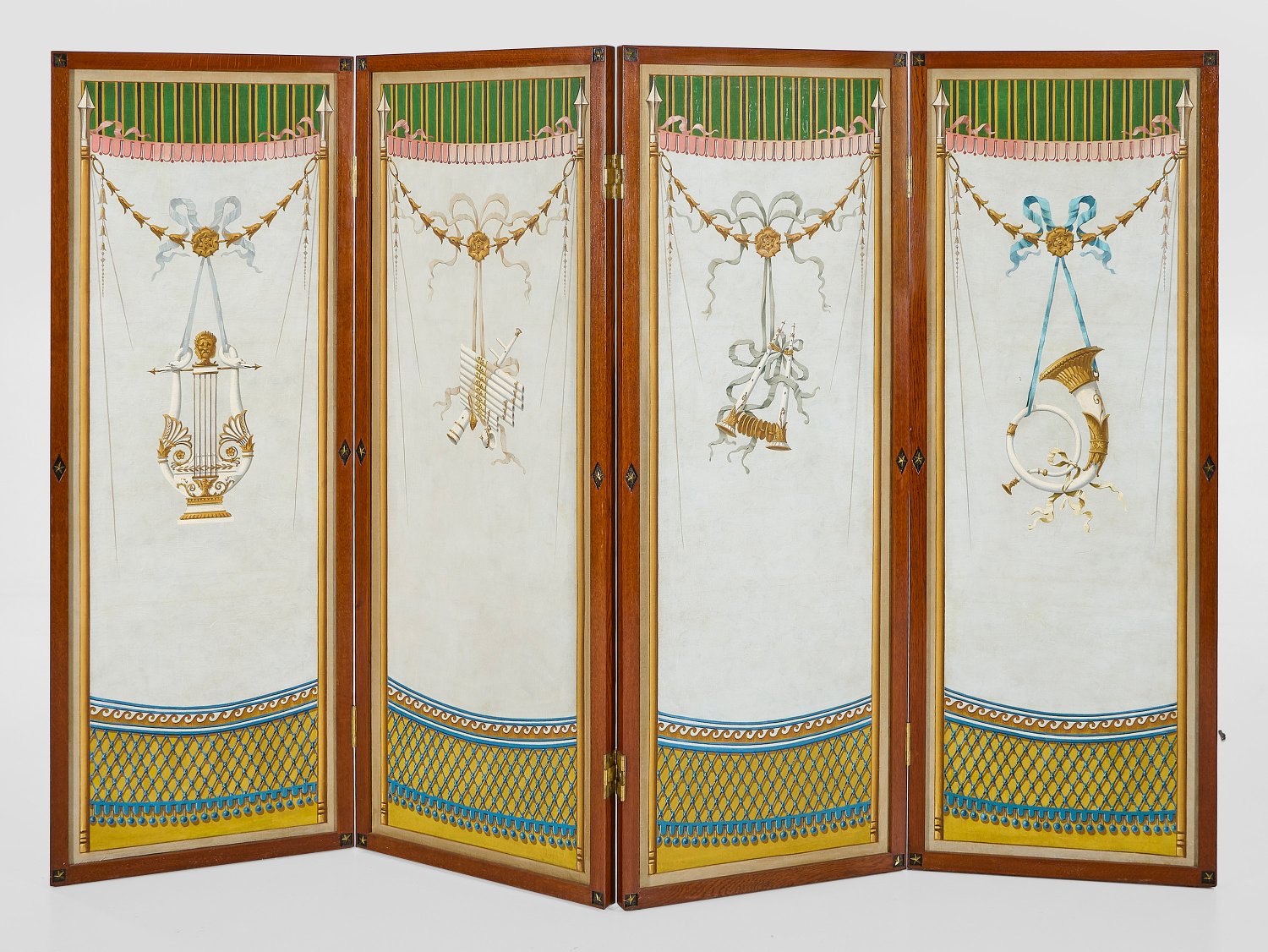 4-tlg.; Eichenholz, mahagonifarben gebeizt und polychrom bemalte Leinwand. Gerade, hochrechteckige, beidseitig faltbare Paneele mit schmaler, gekanteter Rahmung, ausgesparten, ebonisierten Reserven und applizierten Sternmotiven aus Messing. In den Füllungen Darstellungen unterschiedlicher Musikinstrumente, wie Lyra, Panflöte und Horn an großen Schleifenmotiven, flankiert von Speeren. Im Hintergrund gemalte Zeltbahnen mit dekorativem Quastenbehang. Pro Paneel: 157,5 cm x 59 cm.