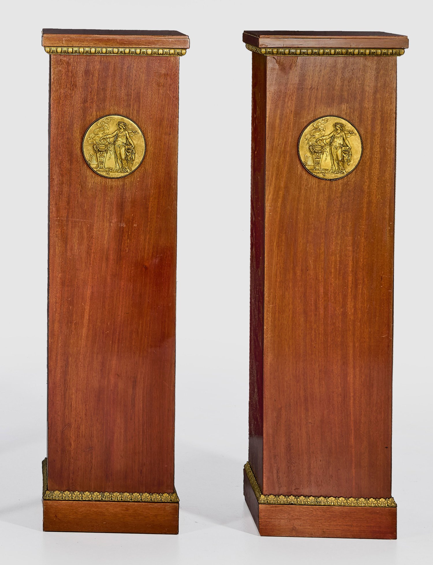 Mahagoni, furniert sowie teilw. vergoldet. Applikationen aus Bronze. Über flachem Zargensockel mit schmalem Palmettenfries, hochrechteckiger Korpus als Träger für korrespondierende Deckplatte mit Eierstabfries. In der Front erhabenes, reliefiertes Tondo mit antikisierender Darstellung. H. 103 cm. 30 cm x 24 cm.