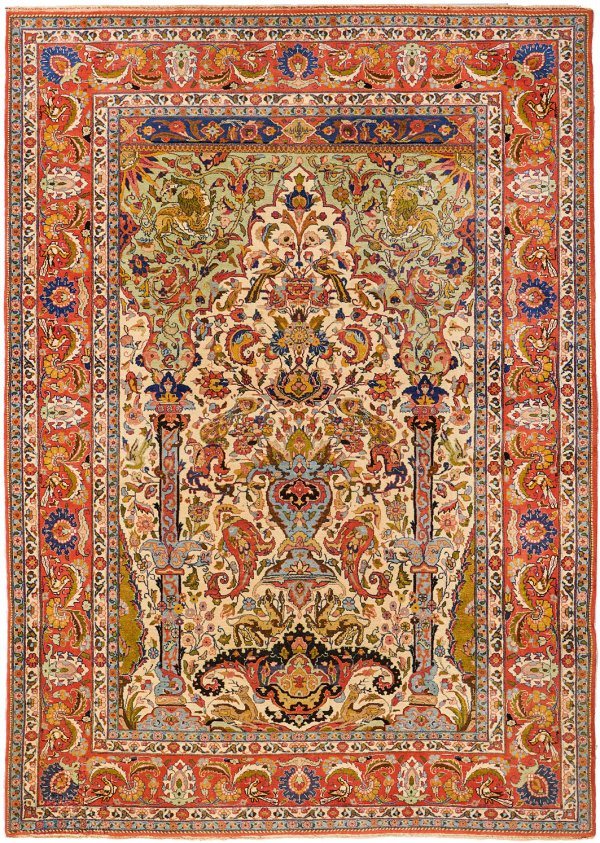 Persien. 1. Hälfte 20. Jh.; Wolle auf Baumwolle. Im elfenbeinfarbenen Innenfeld architektonisch gegliederte Gebetsnische mit zentralem Vasenmotiv. Flächendeckende Musterung aus üppigen Blattranken. Im Giebelfeld Sonnenmotive und Fabelwesen. Umlaufend breite, hellrote Palmettenbordüre. Sign.; Mottenschaden. 146 cm x 210 cm.