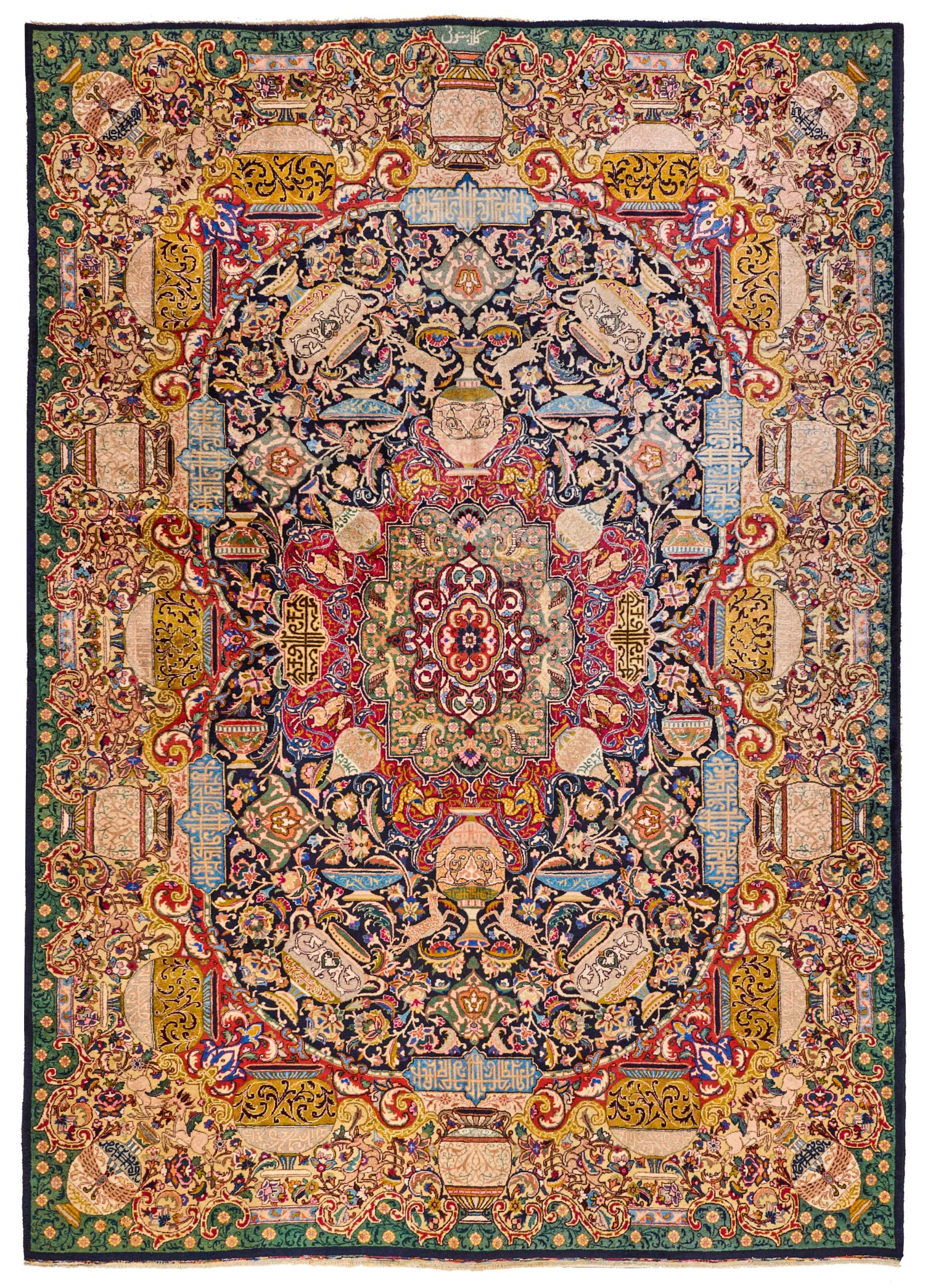 Persien. Wolle auf Baumwolle. Im dunklen, kartuschenförmigen Innenfeld großes Zentralmedaillon sowie flächendeckende Musterung aus Vasenmotiven, Blattranken und Tieren. Umlaufend breite, mehrteilige, passig geschweifte Bordüre aus großen Vasen sowie Kartuschen. Sign.; 248 cm x 343 cm.