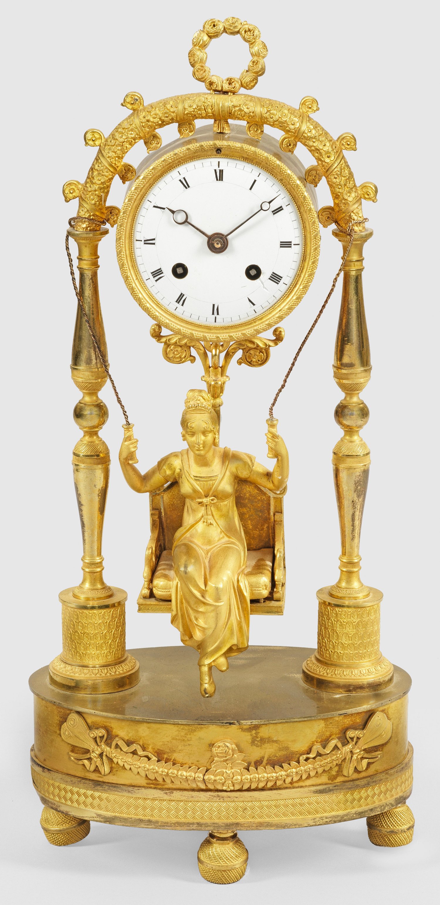 Bronze, teilw. feuervergoldet. Über ovalem Podestsockel mit appliziertem, von Schmetterlingen gehaltenem Feston auf Balusterfüßen, offen gestalteter Korpus aus gegliederten Balusterstäben und Blütenbogen als Träger für rundes Uhrengehäuse. Unterhalb antikisierend gekleidete Dame auf einer Schaukel. Minim. besch. Emailzifferblatt sowie Pendulenwerk mit Fadenaufhängung und Halbstundenschlag auf Glocke. H. 38 cm. 17,5 cm x 10,5 cm.