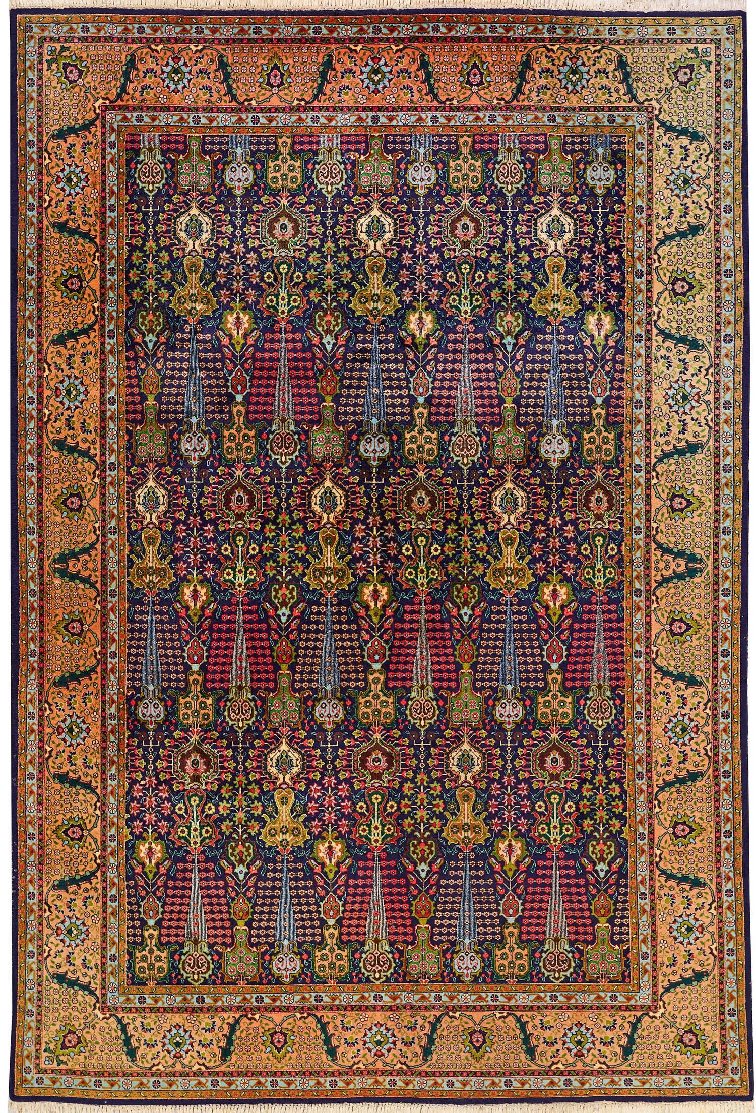 Persien. Mitte 20. Jh.; Wolle auf Baumwolle. Auf dunklem Fond flächendeckende Musterung aus gereihten Lebensbäumen und Blütenrispen im Rapport. Umlaufend rot-orange Hauptbordüre aus Palmettenranken, flankiert von schmalen Bändern. 304 cm x 203 cm.